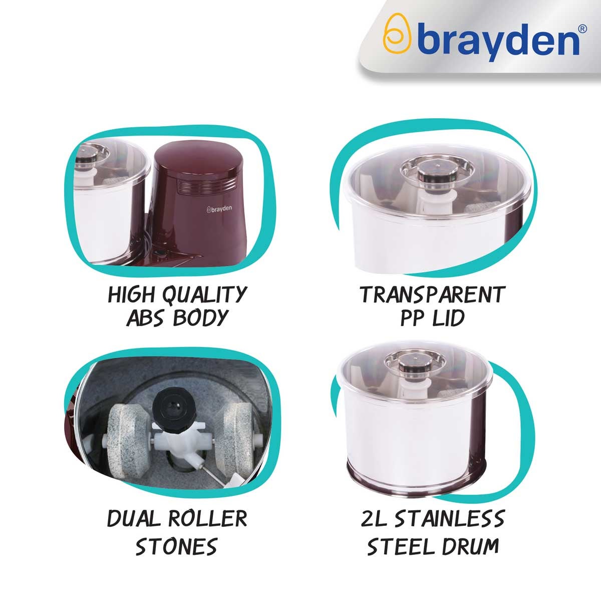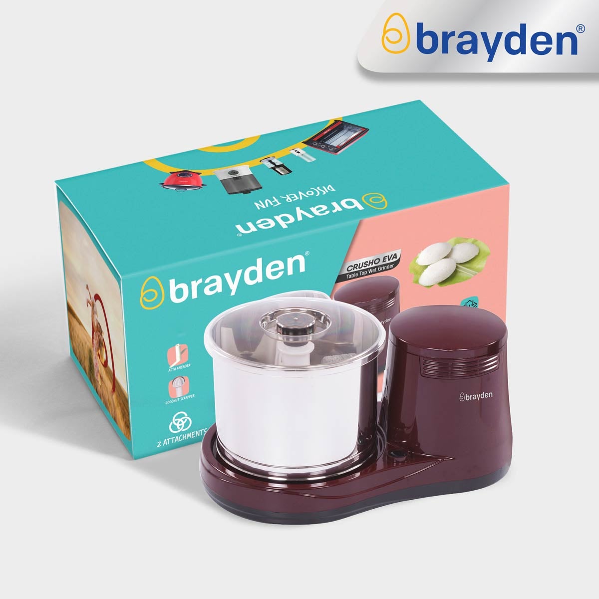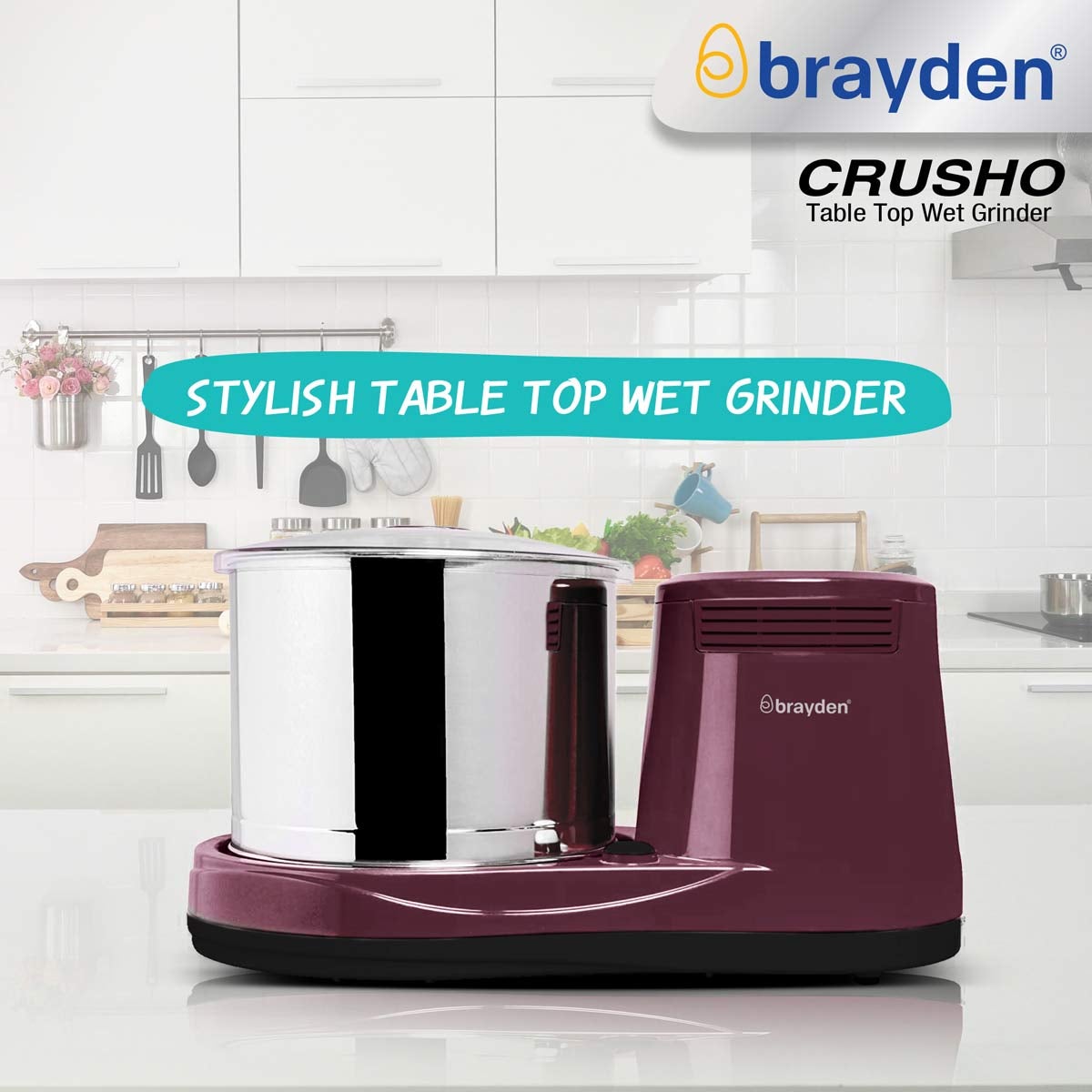 STRONG BODY: Stylish ABS body with compact design makes one pick Brayden crusho table top wet grinder for the kitchen. No doubt, it sufficiently grinds 2 Litre capacity rice/dal in just 20 minutes with 20mm stack.