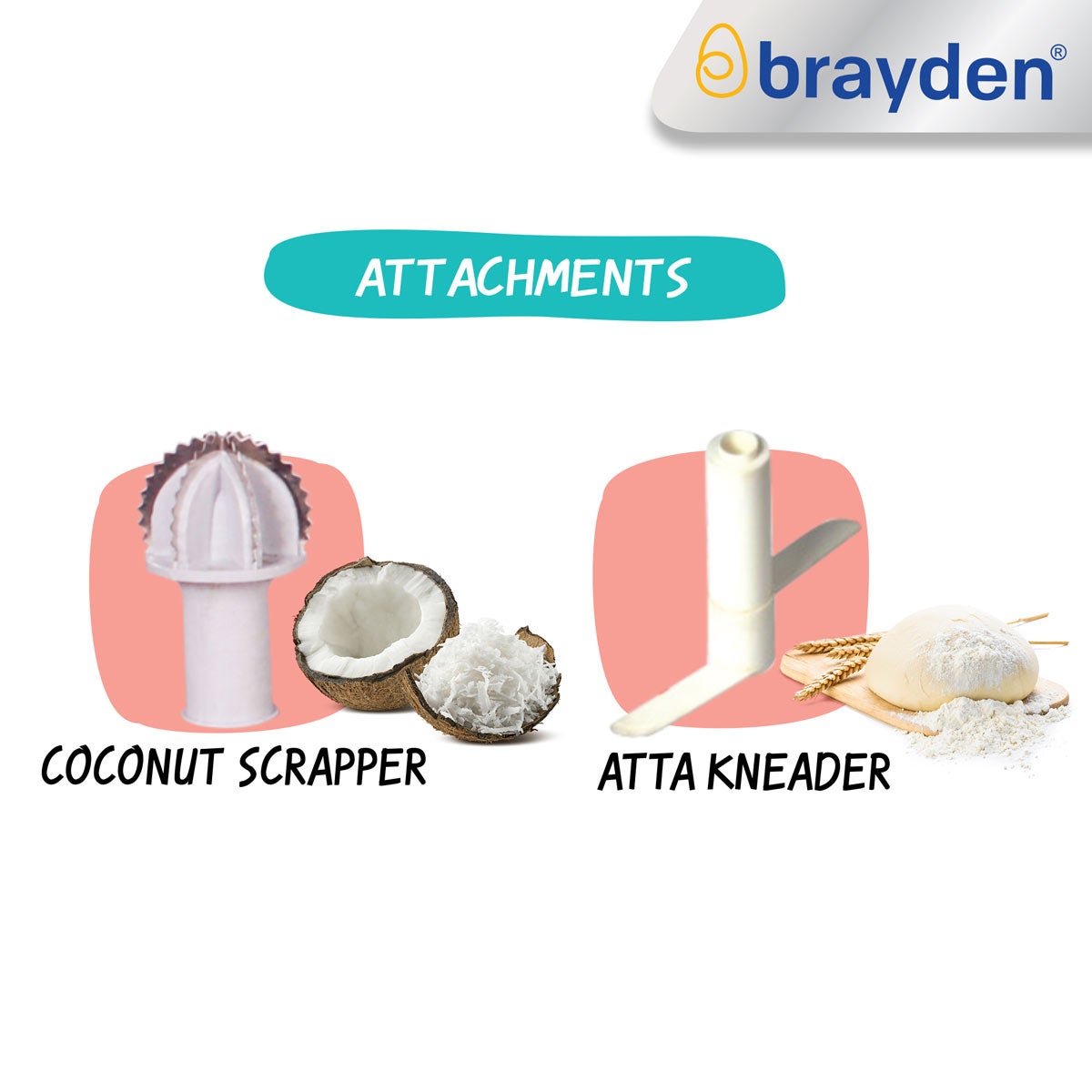 ADD ON: Not just a wet grinder that grinds batter, Crusho multifunctions! But how? It reaches you with three different attachments – Coconut scrapper to scrape coconut in seconds and an atta kneader to knead dough perfectly.